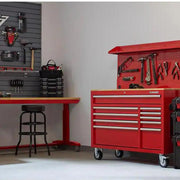 The Husky Modular 52 in. W 10-Drawer Red Mobile Workbench Cabinet with Pegboard is part of a system that allows you to customize your own steel storage configuration. This particular combo consists of the 52 in. 10-Drawer Mobile Workbench and 52 in. Pegboard attachment. Both components are constructed of an all-welded 21-Gauge steel frame and the workbench has a 3/4 in. solid wood top. Ten drawers of varying sizes enable one to find the right place to store and organize all your tools, parts and supplies. All drawers have a pre-cut liner and are equipped with 100 lbs. rated ball-bearing slides that feature a soft-closing mechanism that ensures your drawers do not slam closed. There is an integrated power strip with 6 outlets and 2 USB ports on the side of the workbench that will enable you to charge your tools and other electronics. The pegboard easily attaches to the pre-drilled holes on the workbench and provides a 52 in. x 24 in. surface to hang tools and supplies. A full-width shelf can support up to 100 lbs. Finally, one can easily move the workbench around the workspace on 5 in. x 2 in. casters with the large ergonomic push handle. This Husky Modular 52 in. W 10-Drawer Red Mobile Workbench Cabinet with Pegboard will be a great addition to your workspace on its own or combined with the additional modular components.